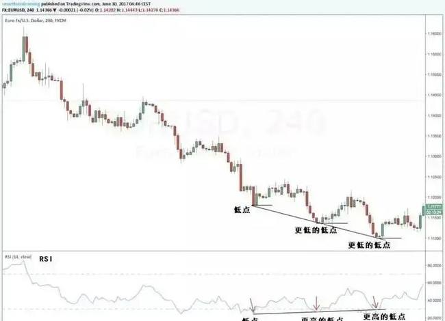 菲利克斯就表示,自己编写了许多基于RSI指标的自动化策略,它们单独运行时几乎性能都很差。一个更好的方法是使用RSI指示器作为设置过滤器,实际的买进或卖出触发器则要采用其他参数。因此,我们需要更靠谱的基于RSI的交易策略,比如RSI背离。RSI背离是指价格在上升趋势中创出较高的高点,而RSI指标创出较低的高点。或者是相反的方向:当价格在下跌趋势中处于较低的低点时,RSI指标处于较高的低点。下面是一个例子: